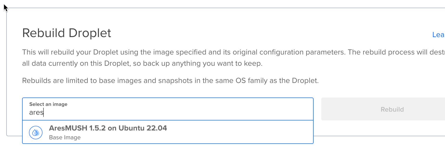 The AresMUSH 1-Click Droplet lets you quickly set up your own Ares game through DigitalOcean. It gives you a server (aka droplet) with all the prerequisites already installed. All you need to do is provide your game information.
